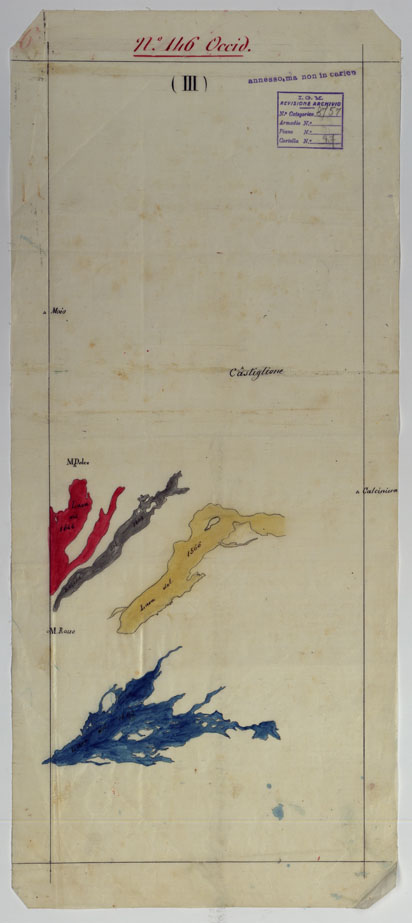 "Disegno in quattro fogli montati su tela a stacchi e due piccole aggiunte, con annessi relativi lucidi. Rappresenta le lave del vulcano dell'Etna nelle sue diverse fasi eruttive, dimostrate mediante vari colori. Si ritiene che questo disegno servisse per formare la carta geologica al 50.000 dell'Etna costruita dal Barone Sartorius di Waltershausen dal 1836 al 1848 e pubblicata in 13 fogli incisi su rame dal 1844 al 1857. Cfr. "Carta topografica dell'Etna..." - N° 123 d'Inv. Gen."