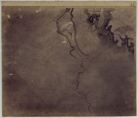 "Disegno in quattrofogli montati su tela a stacchi e due piccole aggiunte, con annessi relativi lucidi. Rappresenta le lave del vulcano dell'Etna nelle sue diverse fasi eruttive, dimostrate mediante vari colori. Si ritiene che questo disegno servisse per formare la carta geologica al 50.000 dell'Etna costruita dal Barone Sartorius di Waltershusen dal 1836 al 1848 e pubblicata in 13 fogli incisi su rame dal 1844 al 1857 (v. N°14 d'ordine)."