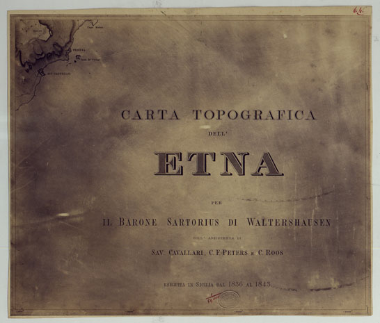 "Disegno in quattro fogli montati su tela a stacchi e due piccole aggiunte, con annessi relativi lucidi. Rappresenta le lave del vulcano dell'Etna nelle sue diverse fasi eruttive, dimostrate mediante vari colori. Si ritiene che questo disegno servisse per formare la carta geologica al 50.000 dell'Etna costruita dal Barone Sartorius di Waltershausen dal 1836 al 1848 e pubblicata in 13 fogli incisi su rame dal 1844 al 1857 (v. N°14 d'ordine)."