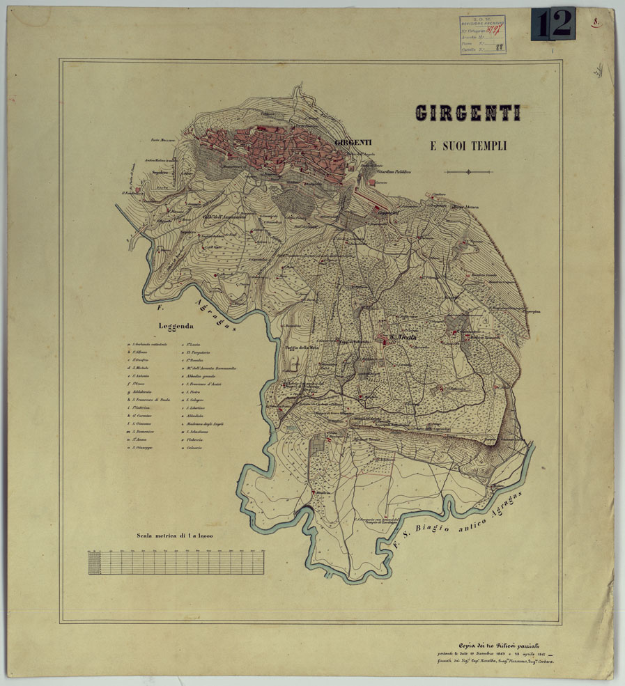"Docum. n. 12. Copia dei rilievi parziali eseguiti dal 1863 al 1867 firmati dal Capitano Rosalba, Luogo.te Pizzocaro, Ing. Corbara. Un foglio nitidamente disegnato a colori con orografia dimostrata mediante curve di livello, tracciate all'equidistanza di m. 5, abitati in rosso, acque in azzurro. La pianta di Girgenti è sussidiata da un elenco alfabetico delle principali costruzioni. Annessi i tre disegni dei rilievi parziali."