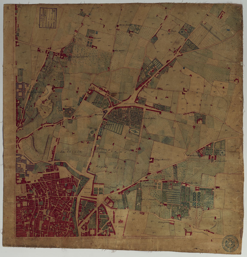"Docum. n. 16. Minute originali in 4 fogli montati su tela della pianta rilevata dagli Ingegneri Geografi dell'Officio Topografico di Napoli, De Simone, Vinci e Biferzi. Le costruzioni sono riempite in rosso le acque sono in azzurro vegetazioni e colture in verde. Il titolo non è presente sulla carta."