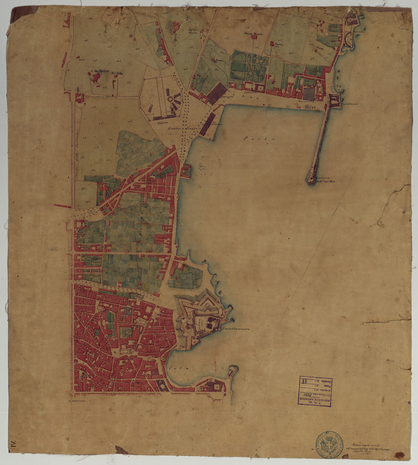 "Docum. n. 16. Minute originali in 4 fogli montati su tela della pianta rilevata dagli Ingegneri Geografi dell'Officio Topografico di Napoli, De Simone, Vinci e Biferzi. Le costruzioni sono riempite in rosso le acque sono in azzurro vegetazioni e colture in verde. Il titolo non è presente sulla carta."