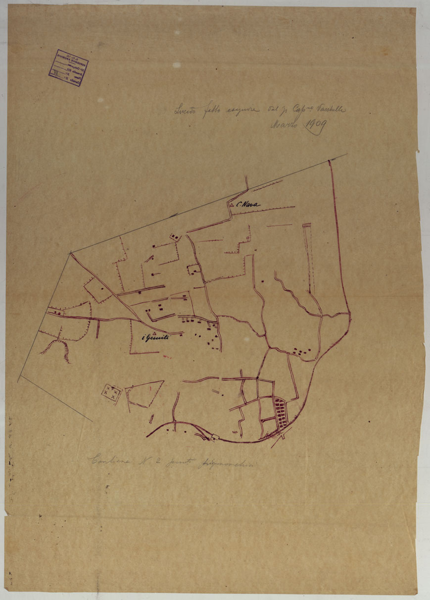 "Docum. 20. Due fogli firmati rispettivamente dall'Ing. G. Bosco e L. Cavalieri, disegnati a colori rosso per le costruzioni, azzurro per le acque, con orografia dimostrata mediante curve di livello tracciate all'equidistanza di m. 10 e tratteggio (rocce). Il foglio settentrionale è corredato di elenco numerico delle principali costruzioni. Annessi tre lucidi e una riproduzione fotografica del foglio settentrionale eseguito dall'I.G.M. nel 1913. Questa è un lucido firmato da G. Bosco."