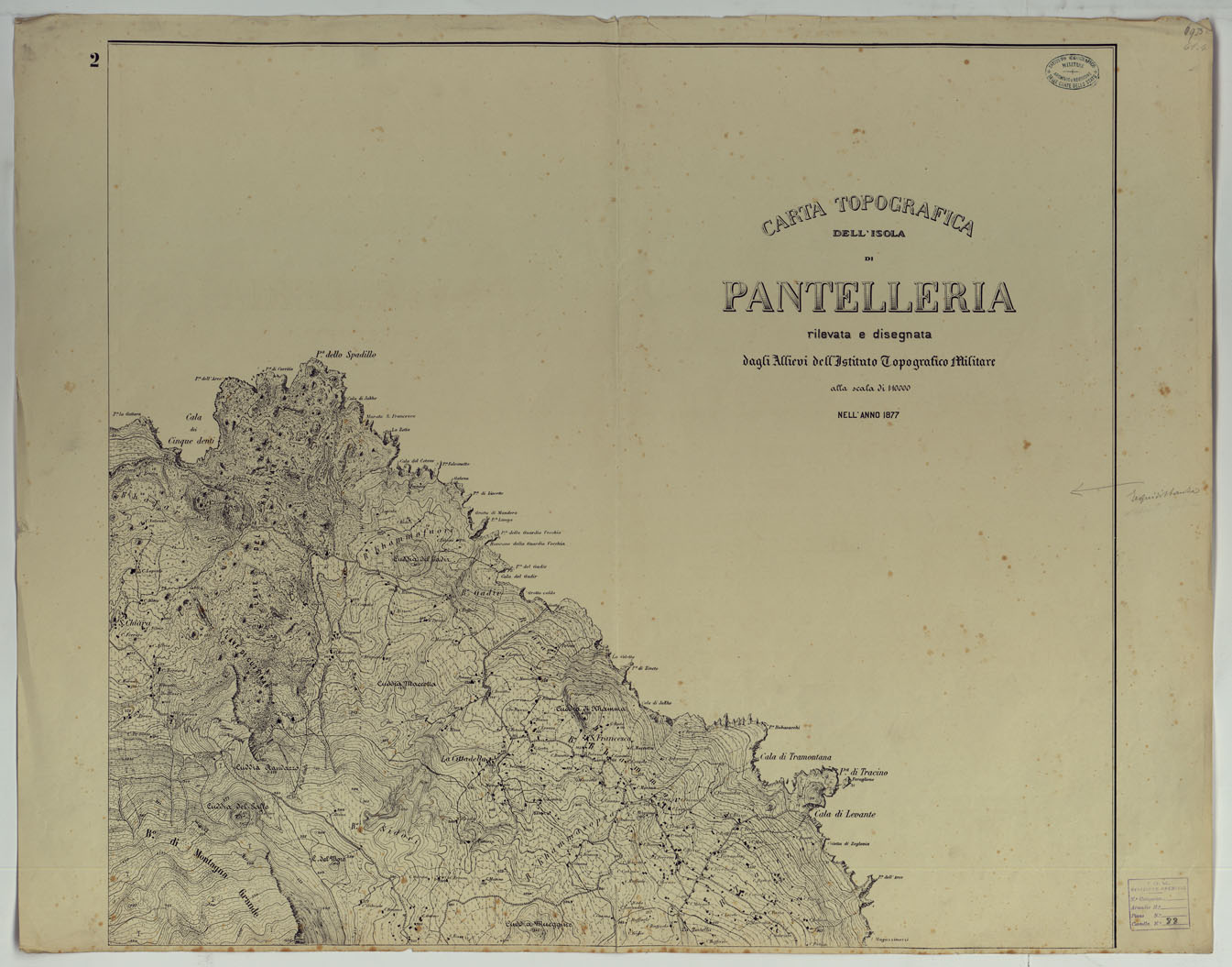 "Docum. n. 29. Quattro fogli montati su cartone. Sono i rilevamenti originali eseguiti sotto la direzione del Cap. di Stato Maggiore C. Canna, disegnati a colore, riuniti a mosaico, pronti per la riproduzione fotolitografica. L'orografia è rappresentata mediante curve di livello tracciate all'equidistanza di 25 metri in bistro e tratteggio per le rocce gli abitati sono in rosso, le acque sono in azzurro, le strade sono classificate in mulattiere grandi e piccole, sentieri facili e difficili. Sono inoltre indicati i muri a secco, fossi asciutti, cimiteri, case, chiese, croci, cisterne, giardini d'agrumi, molini, rovine, abitazioni preistoriche, i segnali trigonometrici,i vigneti, i boschi, gli olivi, le macchie. Il foglio sud-occidentale contiene la leggenda dei segni convenzionali e il quadro d'unione con i nomi degli ufficiali che presero parte al lavoro. Annesso a questo documento la stessa carta in riproduzione fotolitografica in bianco e nero, divisa in 8 fogli di cui una copia anche in appartenenza alla Biblioteca al numero d'Inv. 5716. Sempre in appartenenza alla Biblioteca un'altra copia fotolitografica in quattro fogli in bianco e nero - numero d'Inv. 802."