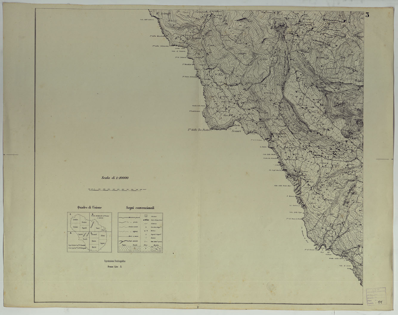 "Docum. n. 29. Quattro fogli montati su cartone. Sono i rilevamenti originali eseguiti sotto la direzione del Cap. di Stato Maggiore C. Canna, disegnati a colore, riuniti a mosaico, pronti per la riproduzione fotolitografica. L'orografia è rappresentata mediante curve di livello tracciate all'equidistanza di 25 metri in bistro e tratteggio per le rocce gli abitati sono in rosso, le acque sono in azzurro, le strade sono classificate in mulattiere grandi e piccole, sentieri facili e difficili. Sono inoltre indicati i muri a secco, fossi asciutti, cimiteri, case, chiese, croci, cisterne, giardini d'agrumi, molini, rovine, abitazioni preistoriche, i segnali trigonometrici,i vigneti, i boschi, gli olivi, le macchie. Il foglio sud-occidentale contiene la leggenda dei segni convenzionali e il quadro d'unione con i nomi degli ufficiali che presero parte al lavoro. Annesso a questo documento la stessa carta in riproduzione fotolitografica in bianco e nero, divisa in 8 fogli di cui una copia anche in appartenenza alla Biblioteca al numero d'Inv. 5716. Sempre in appartenenza alla Biblioteca un'altra copia fotolitografica in quattro fogli in bianco e nero - numero d'Inv. 802."