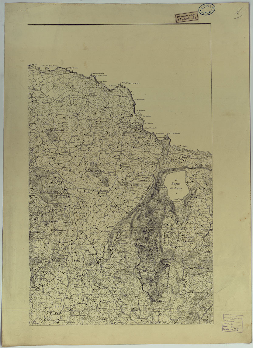 "Docum. n. 29. Quattro fogli montati su cartone. Sono i rilevamenti originali eseguiti sotto la direzione del Cap. di Stato Maggiore C. Canna, disegnati a colore, riuniti a mosaico, pronti per la riproduzione fotolitografica. L'orografia è rappresentata mediante curve di livello tracciate all'equidistanza di 25 metri in bistro e tratteggio per le rocce gli abitati sono in rosso, le acque sono in azzurro, le strade sono classificate in mulattiere grandi e piccole, sentieri facili e difficili. Sono inoltre indicati i muri a secco, fossi asciutti, cimiteri, case, chiese, croci, cisterne, giardini d'agrumi, molini, rovine, abitazioni preistoriche, i segnali trigonometrici,i vigneti, i boschi, gli olivi, le macchie. Il foglio sud-occidentale contiene la leggenda dei segni convenzionali e il quadro d'unione con i nomi degli ufficiali che presero parte al lavoro. Annesso a questo documento la stessa carta in riproduzione fotolitografica in bianco e nero, divisa in 8 fogli di cui una copia anche in appartenenza alla Biblioteca al numero d'Inv. 5716. Sempre in appartenenza alla Biblioteca un'altra copia fotolitografica in quattro fogli in bianco e nero - numero d'Inv. 802."