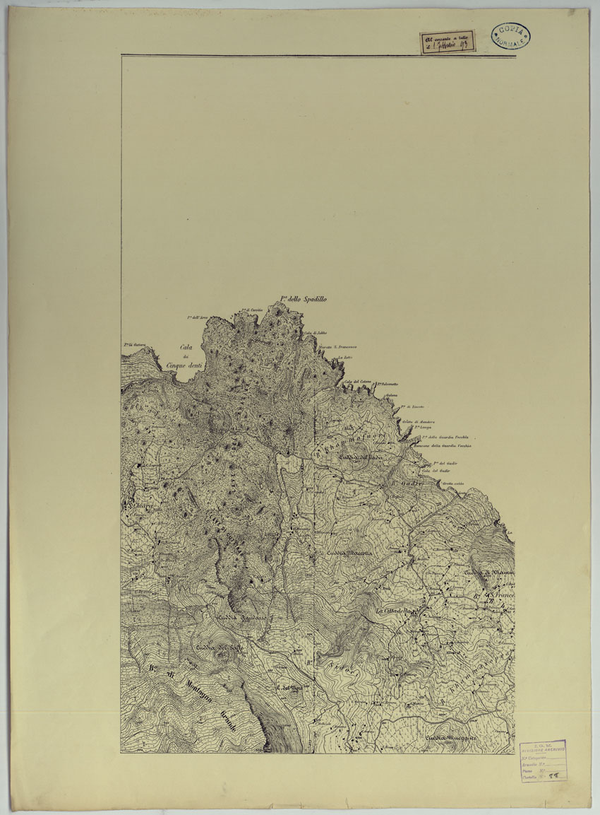 "Docum. n. 29. Quattro fogli montati su cartone. Sono i rilevamenti originali eseguiti sotto la direzione del Cap. di Stato Maggiore C. Canna, disegnati a colore, riuniti a mosaico, pronti per la riproduzione fotolitografica. L'orografia è rappresentata mediante curve di livello tracciate all'equidistanza di 25 metri in bistro e tratteggio per le rocce gli abitati sono in rosso, le acque sono in azzurro, le strade sono classificate in mulattiere grandi e piccole, sentieri facili e difficili. Sono inoltre indicati i muri a secco, fossi asciutti, cimiteri, case, chiese, croci, cisterne, giardini d'agrumi, molini, rovine, abitazioni preistoriche, i segnali trigonometrici,i vigneti, i boschi, gli olivi, le macchie. Il foglio sud-occidentale contiene la leggenda dei segni convenzionali e il quadro d'unione con i nomi degli ufficiali che presero parte al lavoro. Annesso a questo documento la stessa carta in riproduzione fotolitografica in bianco e nero, divisa in 8 fogli di cui una copia anche in appartenenza alla Biblioteca al numero d'Inv. 5716. Sempre in appartenenza alla Biblioteca un'altra copia fotolitografica in quattro fogli in bianco e nero - numero d'Inv. 802."