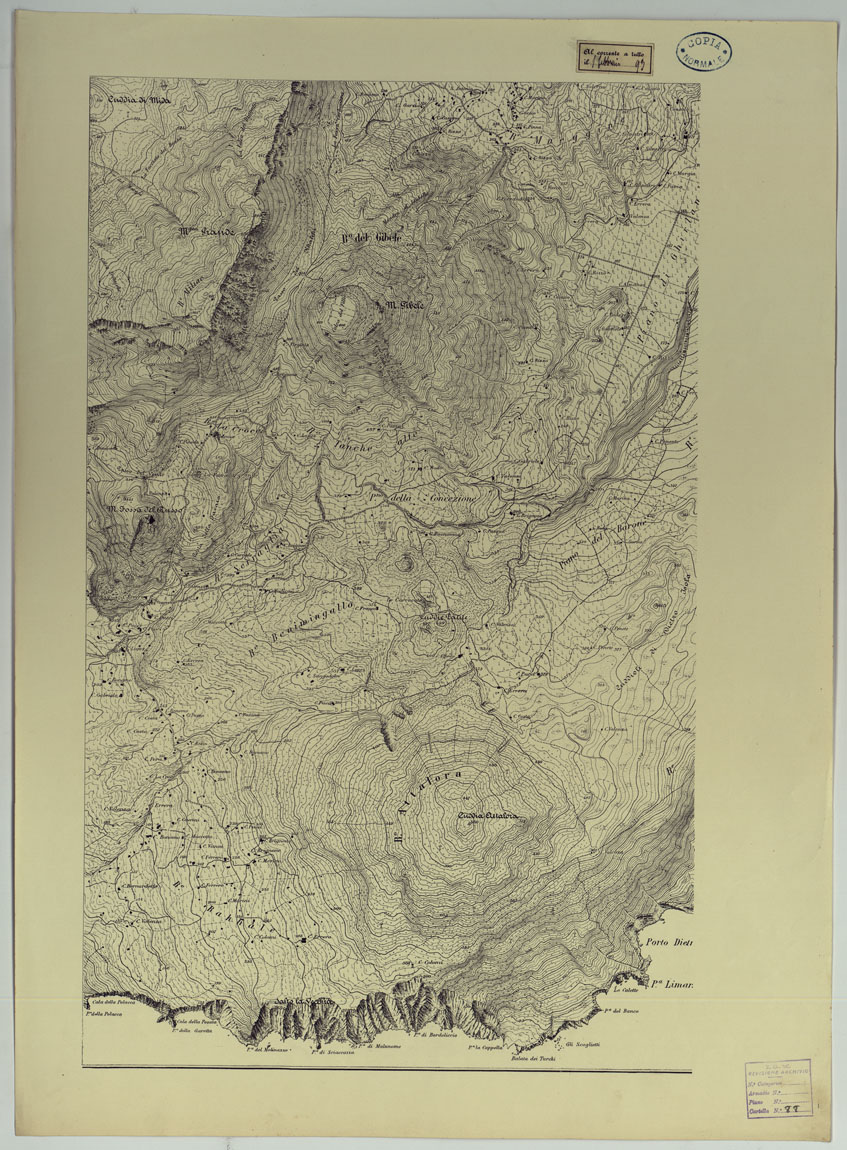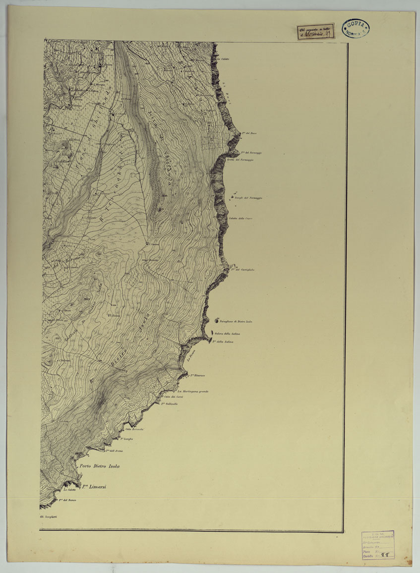 "Docum. n. 29. Quattro fogli montati su cartone. Sono i rilevamenti originali eseguiti sotto la direzione del Cap. di Stato Maggiore C. Canna, disegnati a colore, riuniti a mosaico, pronti per la riproduzione fotolitografica. L'orografia è rappresentata mediante curve di livello tracciate all'equidistanza di 25 metri in bistro e tratteggio per le rocce gli abitati sono in rosso, le acque sono in azzurro, le strade sono classificate in mulattiere grandi e piccole, sentieri facili e difficili. Sono inoltre indicati i muri a secco, fossi asciutti, cimiteri, case, chiese, croci, cisterne, giardini d'agrumi, molini, rovine, abitazioni preistoriche, i segnali trigonometrici,i vigneti, i boschi, gli olivi, le macchie. Il foglio sud-occidentale contiene la leggenda dei segni convenzionali e il quadro d'unione con i nomi degli ufficiali che presero parte al lavoro. Annesso a questo documento la stessa carta in riproduzione fotolitografica in bianco e nero, divisa in 8 fogli di cui una copia anche in appartenenza alla Biblioteca al numero d'Inv. 5716. Sempre in appartenenza alla Biblioteca un'altra copia fotolitografica in quattro fogli in bianco e nero - numero d'Inv. 802."