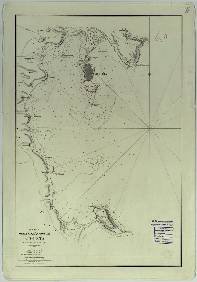 "Docum. 11. Incisione in rame in foglio unico, riproduzione dell'originale inglese eseguita dal Reale Officio Topografico di Napoli. Annesso lo stesso originale, pubblicato a Londra dall'Ufficio Idrografico inglese. L'orografia è rappresentata col tratteggio. Gli scandagli sono calcolati in fathoms e nella riproduzione in piedi parigini. Questa è la carta eseguita dal Reale Officio Topografico di Napoli."