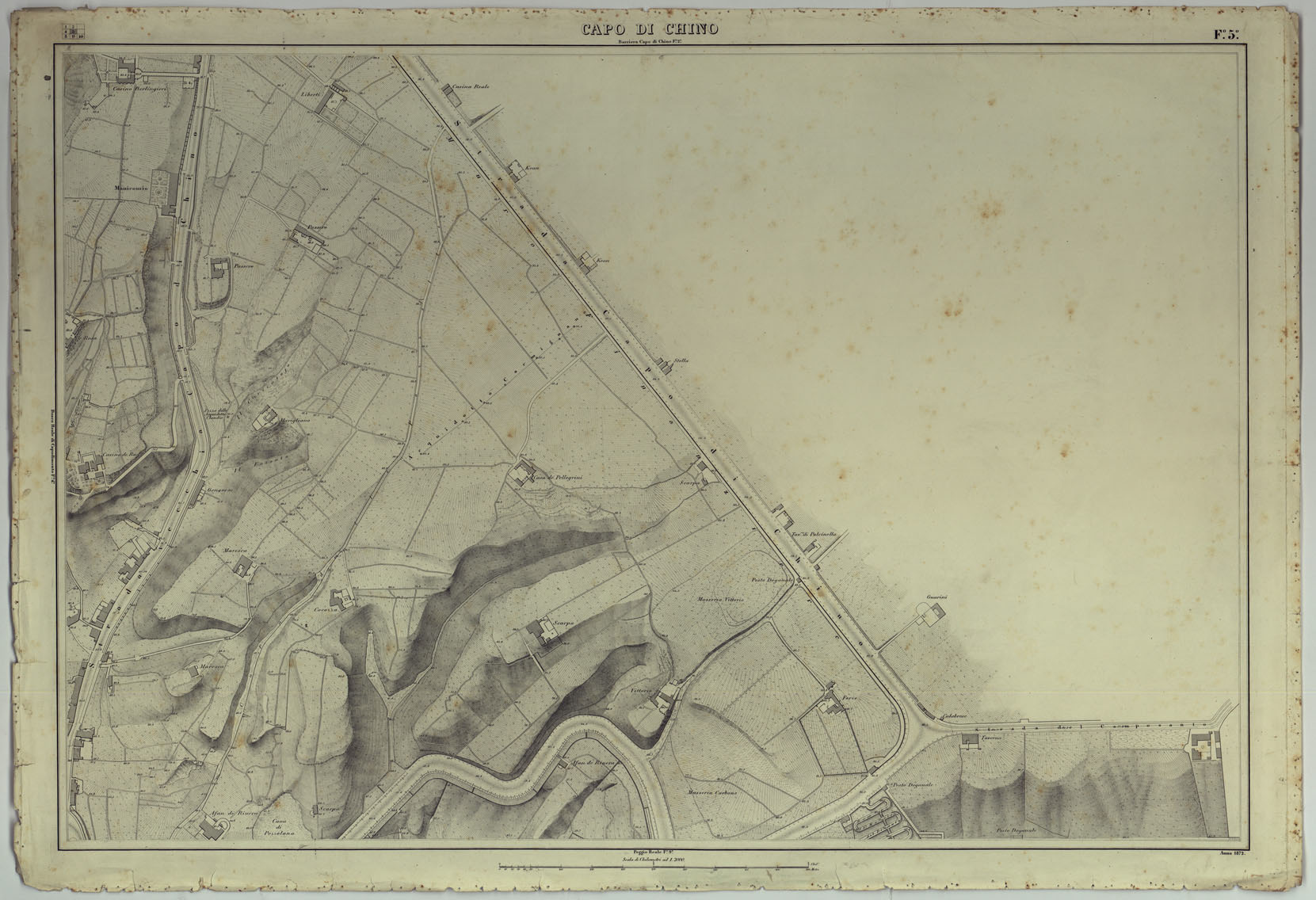 "La carta si compone di 23 fogli incisi su rame stampati in nero. Essa fu costruita a cura del Municipio di Napoli sotto la direzione del Prof. di Geodesia C. Schiavoni, iniziata nel 1863 e ultimata verso il 1870. L'orografia è rappresentata col tratteggio e curve di livello tracciate all'equidistanza di m. 2. Gli scandagli sono calcolati in metri. Due copie una delle quali in fogli montati su tela e con curve batometriche (Docum. n. 15). Il titolo non è presente sulla carta."