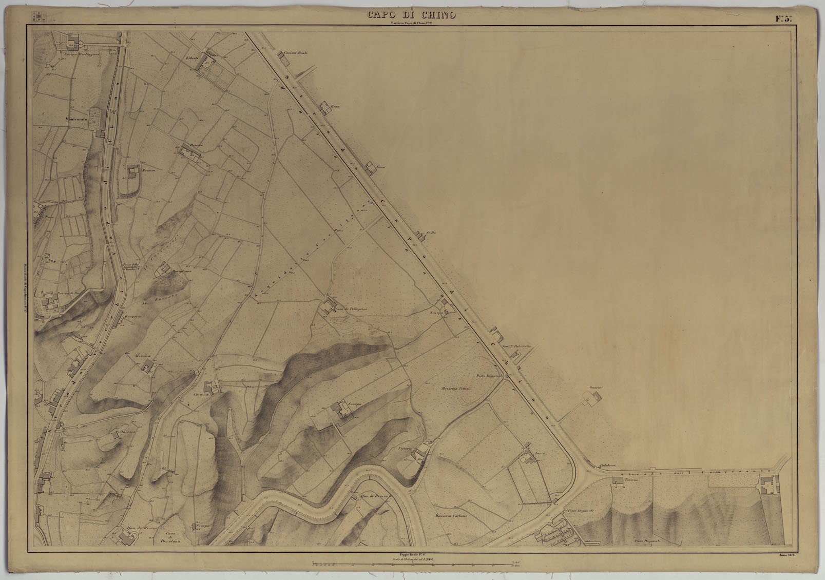 "La carta si compone di 23 fogli incisi su rame stampati in nero. Essa fu costruita a cura del Municipio di Napoli sotto la direzione del Prof. di Geodesia C. Schiavoni, iniziata nel 1863 e ultimata verso il 1870. L'orografia è rappresentata col tratteggio e curve di livello tracciate all'equidistanza di m. 2. Gli scandagli sono calcolati in metri. Due copie una delle quali in fogli montati su tela e con curve batometriche (Docum. n. 15). Il titolo non è presente sulla carta."