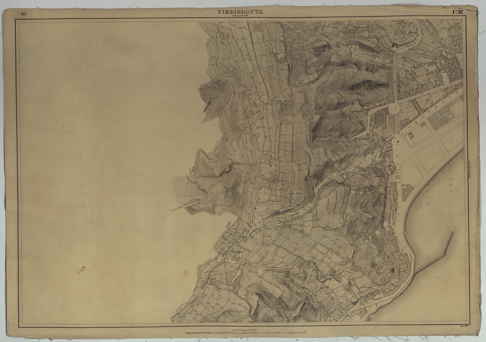 "La carta si compone di 23 fogli incisi su rame stampati in nero. Essa fu costruita a cura del Municipio di Napoli sotto la direzione del Prof. di Geodesia C. Schiavoni, iniziata nel 1863 e ultimata verso il 1870. L'orografia è rappresentata col tratteggio e curve di livello tracciate all'equidistanza di m. 2. Gli scandagli sono calcolati in metri. Due copie una delle quali in fogli montati su tela e con curve batometriche (Docum. n. 15). Il titolo non è presente sulla carta."