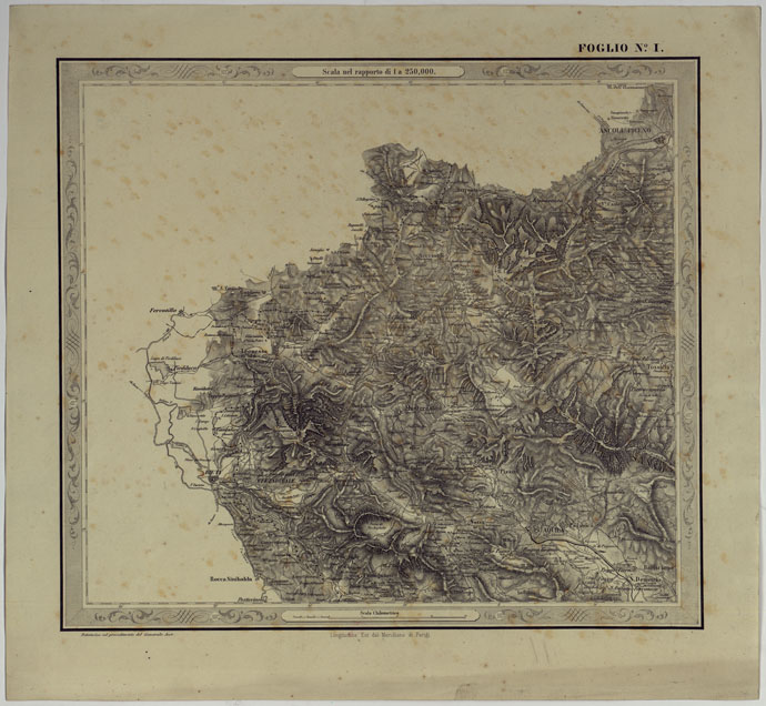 "Bella, pregevolissima carta. E' in 25 fogli oltre il foglio titolo. Su di questo sono dati i seguenti " Cenni sulla costruzione della Carta " : "Questa carta corografica è tratta da una topografica disegnata a mano alla scala di 1: 103.680, che si trovava negli Archivi dell ' ex- Ufficio Topografico di Napoli e che era dovuta allo Stato Maggiore Austriaco. Essa fu eseguita durante l'occupazione di quel Regno dal 1821 al 1824, e ne fu fondamento la nota carta del Rizzi-Zannoni, di cui la Carta Austriaca è per così dire una trasformazione. Difatti la planimetria fu poco o punto modificata ma si dette un maggior rilievo all'orografia, sostituendo, previe ricognizioni sul terreno, il metodo del tratteggio a luce zenitale, a quello della prospettiva cavaliera col quale sono rappresentate le alture nelle Carte del Zannoni. Non è certamente, né può essere un lavoro di grande esattezza geometrica, come quello che non dipende da rilievi regolari e molto meno da coordinazione di questi ad una rete di punti geodetici. Nonostante il Comitato dello Stato Maggiore credè di rendere un servizio alle varie Amministrazioni dello Stato ed al pubblico, deliberando, sin dall ' anno 1868, di utilizzarla (in via transitoria e intanto che si compivano i rilievi regolari nelle provincie meridionali) con lo scopo di somministrare una guida sufficiente al militare, al geografo ed al viaggiatore. La carta fu riconosciuta sul terreno negli anni 1868-1869 onde completarvi il sistema delle strade rotabili a fondo manufatto. Di poi si operò il disegno dei vari fogli alla scala di 1: 250.000, che fu adottata per la pubblicazione. Così ridotta essa consta di 25 fogli. La riproduzione ne fu eseguita con il sistema di fotoincisione del Maggior Generale Conte Avet ". (vedi: N. 39 d'Ordine, Cart. d'Arch. N° 71 - Docum. N° 9021 - Files A0001415-1491, e N. 61 d' Ordine, Cart. d 'Arch. N° 72 Docum. N° 9022. Alla carta è unito un quadro d ' unione. Due copie, una delle quali incompleta e l 'altra, completa, riveduta dal 1882-1884. Una copia è questo documento d'Archivio, le altre sono d'appartenenza alla Biblioteca ai numeri d'Inv. gen. 50 e 50bis. In questo documento sono mancanti i fogli 9-13-15-16-17-20-25."