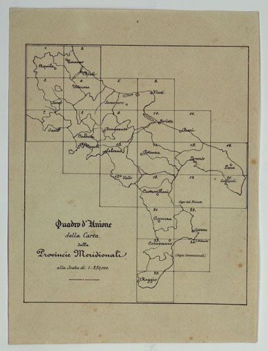CARTA DELLE PROVINCE NAPOLITANE IN FOGLI 25 FOTOINCISA COL PROCEDIMENTO DEL GENERALE AVET ALLA SCALA DI 1:250.000 COPIA COMPLETA RIVEDUTA DAL 1882 AL 1884 PUBBLICATA DALL'ISTITUTO TOPOGRAFICO MILITARE, 1874 - QUADRO D'UNIONE.
