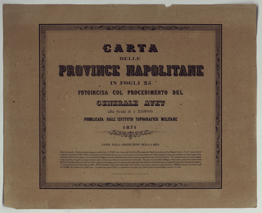 CARTA DELLE PROVINCE NAPOLITANE IN FOGLI 25 FOTOINCISA COL PROCEDIMENTO DEL GENERALE AVET ALLA SCALA DI 1:250.000 COPIA COMPLETA RIVEDUTA DAL 1882 AL 1884 PUBBLICATA DALL'ISTITUTO TOPOGRAFICO MILITARE, 1874 - TITOLO.