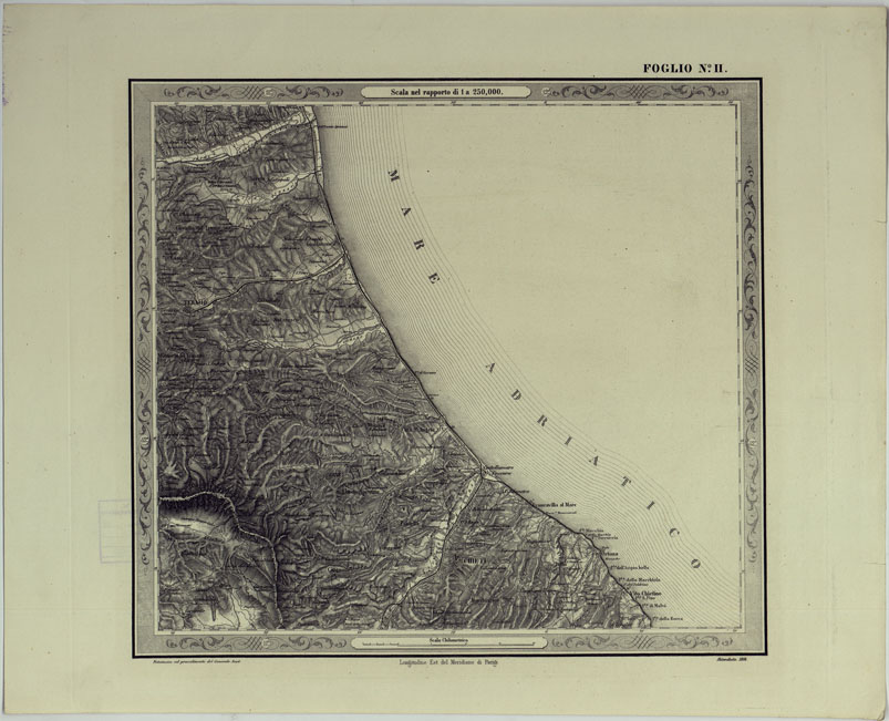 "Bella, pregevolissima carta. E' in 25 fogli oltre il foglio titolo. Su di questo sono dati i seguenti " Cenni sulla costruzione della Carta " : "Questa carta corografica è tratta da una topografica disegnata a mano alla scala di 1: 103.680, che si trovava negli Archivi dell ' ex- Ufficio Topografico di Napoli e che era dovuta allo Stato Maggiore Austriaco. Essa fu eseguita durante l'occupazione di quel Regno dal 1821 al 1824, e ne fu fondamento la nota carta del Rizzi-Zannoni, di cui la Carta Austriaca è per così dire una trasformazione. Difatti la planimetria fu poco o punto modificata ma si dette un maggior rilievo all'orografia, sostituendo, previe ricognizioni sul terreno, il metodo del tratteggio a luce zenitale, a quello della prospettiva cavaliera col quale sono rappresentate le alture nelle Carte del Zannoni. Non è certamente, né può essere un lavoro di grande esattezza geometrica, come quello che non dipende da rilievi regolari e molto meno da coordinazione di questi ad una rete di punti geodetici. Nonostante il Comitato dello Stato Maggiore credè di rendere un servizio alle varie Amministrazioni dello Stato ed al pubblico, deliberando, sin dall ' anno 1868, di utilizzarla (in via transitoria e intanto che si compivano i rilievi regolari nelle provincie meridionali) con lo scopo di somministrare una guida sufficiente al militare, al geografo ed al viaggiatore. La carta fu riconosciuta sul terreno negli anni 1868-1869 onde completarvi il sistema delle strade rotabili a fondo manufatto. Di poi si operò il disegno dei vari fogli alla scala di 1: 250.000, che fu adottata per la pubblicazione. Così ridotta essa consta di 25 fogli. La riproduzione ne fu eseguita con il sistema di fotoincisione del Maggior Generale Conte Avet ". (vedi: N. 39 d'Ordine, Cart. d'Arch. N° 71 - Docum. N° 9021, e N. 61 d' Ordine, Cart. d 'Arch. N° 72 Docum. N° 9022. Alla carta è unito un quadro d ' unione. Due copie, una delle quali incompleta e l 'altra, completa, riveduta dal 1882-1884. Una copia è questo documento d'Archivio, le altre sono d'appartenenza alla Biblioteca ai numeri d'Inv. gen. 50 e 50bis. In questo documento sono mancanti i fogli 9-13-15-16-17-20-25."
