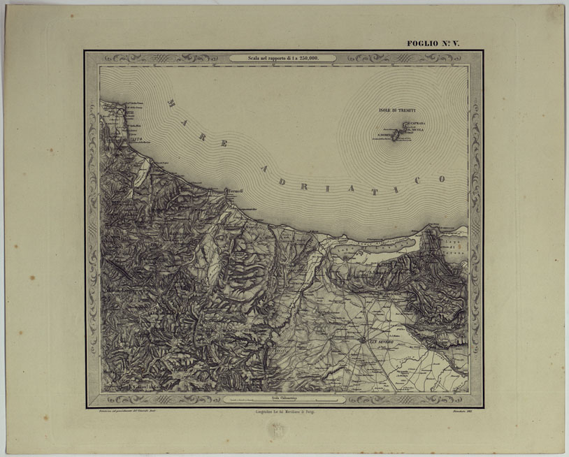 "Bella, pregevolissima carta. E' in 25 fogli oltre il foglio titolo. Su di questo sono dati i seguenti " Cenni sulla costruzione della Carta " : "Questa carta corografica è tratta da una topografica disegnata a mano alla scala di 1: 103.680, che si trovava negli Archivi dell ' ex- Ufficio Topografico di Napoli e che era dovuta allo Stato Maggiore Austriaco. Essa fu eseguita durante l'occupazione di quel Regno dal 1821 al 1824, e ne fu fondamento la nota carta del Rizzi-Zannoni, di cui la Carta Austriaca è per così dire una trasformazione. Difatti la planimetria fu poco o punto modificata ma si dette un maggior rilievo all'orografia, sostituendo, previe ricognizioni sul terreno, il metodo del tratteggio a luce zenitale, a quello della prospettiva cavaliera col quale sono rappresentate le alture nelle Carte del Zannoni. Non è certamente, né può essere un lavoro di grande esattezza geometrica, come quello che non dipende da rilievi regolari e molto meno da coordinazione di questi ad una rete di punti geodetici. Nonostante il Comitato dello Stato Maggiore credè di rendere un servizio alle varie Amministrazioni dello Stato ed al pubblico, deliberando, sin dall ' anno 1868, di utilizzarla (in via transitoria e intanto che si compivano i rilievi regolari nelle provincie meridionali) con lo scopo di somministrare una guida sufficiente al militare, al geografo ed al viaggiatore. La carta fu riconosciuta sul terreno negli anni 1868-1869 onde completarvi il sistema delle strade rotabili a fondo manufatto. Di poi si operò il disegno dei vari fogli alla scala di 1: 250.000, che fu adottata per la pubblicazione. Così ridotta essa consta di 25 fogli. La riproduzione ne fu eseguita con il sistema di fotoincisione del Maggior Generale Conte Avet ". (vedi: N. 39 d'Ordine, Cart. d'Arch. N° 71 - Docum. N° 9021, e N. 61 d' Ordine, Cart. d 'Arch. N° 72 Docum. N° 9022. Alla carta è unito un quadro d ' unione. Due copie, una delle quali incompleta e l 'altra, completa, riveduta dal 1882-1884. Una copia è questo documento d'Archivio, le altre sono d'appartenenza alla Biblioteca ai numeri d'Inv. gen. 50 e 50bis. In questo documento sono mancanti i fogli 9-13-15-16-17-20-25."