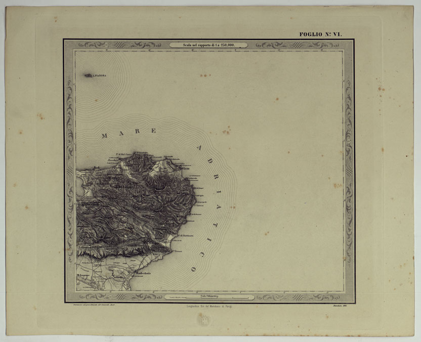 "Bella, pregevolissima carta. E' in 25 fogli oltre il foglio titolo. Su di questo sono dati i seguenti " Cenni sulla costruzione della Carta " : "Questa carta corografica è tratta da una topografica disegnata a mano alla scala di 1: 103.680, che si trovava negli Archivi dell ' ex- Ufficio Topografico di Napoli e che era dovuta allo Stato Maggiore Austriaco. Essa fu eseguita durante l'occupazione di quel Regno dal 1821 al 1824, e ne fu fondamento la nota carta del Rizzi-Zannoni, di cui la Carta Austriaca è per così dire una trasformazione. Difatti la planimetria fu poco o punto modificata ma si dette un maggior rilievo all'orografia, sostituendo, previe ricognizioni sul terreno, il metodo del tratteggio a luce zenitale, a quello della prospettiva cavaliera col quale sono rappresentate le alture nelle Carte del Zannoni. Non è certamente, né può essere un lavoro di grande esattezza geometrica, come quello che non dipende da rilievi regolari e molto meno da coordinazione di questi ad una rete di punti geodetici. Nonostante il Comitato dello Stato Maggiore credè di rendere un servizio alle varie Amministrazioni dello Stato ed al pubblico, deliberando, sin dall ' anno 1868, di utilizzarla (in via transitoria e intanto che si compivano i rilievi regolari nelle provincie meridionali) con lo scopo di somministrare una guida sufficiente al militare, al geografo ed al viaggiatore. La carta fu riconosciuta sul terreno negli anni 1868-1869 onde completarvi il sistema delle strade rotabili a fondo manufatto. Di poi si operò il disegno dei vari fogli alla scala di 1: 250.000, che fu adottata per la pubblicazione. Così ridotta essa consta di 25 fogli. La riproduzione ne fu eseguita con il sistema di fotoincisione del Maggior Generale Conte Avet ". (vedi: N. 39 d'Ordine, Cart. d'Arch. N° 71 - Docum. N° 9021, e N. 61 d' Ordine, Cart. d 'Arch. N° 72 Docum. N° 9022. Alla carta è unito un quadro d ' unione. Due copie, una delle quali incompleta e l 'altra, completa, riveduta dal 1882-1884. Una copia è questo documento d'Archivio, le altre sono d'appartenenza alla Biblioteca ai numeri d'Inv. gen. 50 e 50bis. In questo documento sono mancanti i fogli 9-13-15-16-17-20-25."