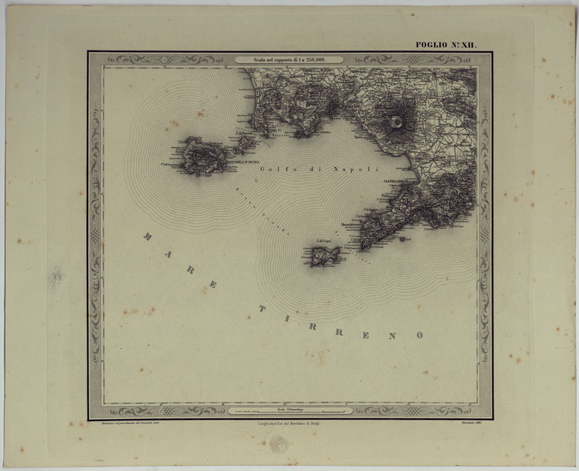 "Bella, pregevolissima carta. E' in 25 fogli oltre il foglio titolo. Su di questo sono dati i seguenti " Cenni sulla costruzione della Carta " : "Questa carta corografica è tratta da una topografica disegnata a mano alla scala di 1: 103.680, che si trovava negli Archivi dell ' ex- Ufficio Topografico di Napoli e che era dovuta allo Stato Maggiore Austriaco. Essa fu eseguita durante l'occupazione di quel Regno dal 1821 al 1824, e ne fu fondamento la nota carta del Rizzi-Zannoni, di cui la Carta Austriaca è per così dire una trasformazione. Difatti la planimetria fu poco o punto modificata ma si dette un maggior rilievo all'orografia, sostituendo, previe ricognizioni sul terreno, il metodo del tratteggio a luce zenitale, a quello della prospettiva cavaliera col quale sono rappresentate le alture nelle Carte del Zannoni. Non è certamente, né può essere un lavoro di grande esattezza geometrica, come quello che non dipende da rilievi regolari e molto meno da coordinazione di questi ad una rete di punti geodetici. Nonostante il Comitato dello Stato Maggiore credè di rendere un servizio alle varie Amministrazioni dello Stato ed al pubblico, deliberando, sin dall ' anno 1868, di utilizzarla (in via transitoria e intanto che si compivano i rilievi regolari nelle provincie meridionali) con lo scopo di somministrare una guida sufficiente al militare, al geografo ed al viaggiatore. La carta fu riconosciuta sul terreno negli anni 1868-1869 onde completarvi il sistema delle strade rotabili a fondo manufatto. Di poi si operò il disegno dei vari fogli alla scala di 1: 250.000, che fu adottata per la pubblicazione. Così ridotta essa consta di 25 fogli. La riproduzione ne fu eseguita con il sistema di fotoincisione del Maggior Generale Conte Avet ". (vedi: N. 39 d'Ordine, Cart. d'Arch. N° 71 - Docum. N° 9021, e N. 61 d' Ordine, Cart. d 'Arch. N° 72 Docum. N° 9022. Alla carta è unito un quadro d ' unione. Due copie, una delle quali incompleta e l 'altra, completa, riveduta dal 1882-1884. Una copia è questo documento d'Archivio, le altre sono d'appartenenza alla Biblioteca ai numeri d'Inv. gen. 50 e 50bis. In questo documento sono mancanti i fogli 9-13-15-16-17-20-25."