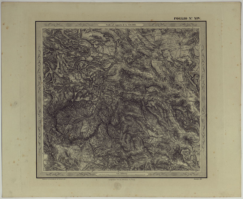 "Bella, pregevolissima carta. E' in 25 fogli oltre il foglio titolo. Su di questo sono dati i seguenti " Cenni sulla costruzione della Carta " : "Questa carta corografica è tratta da una topografica disegnata a mano alla scala di 1: 103.680, che si trovava negli Archivi dell ' ex- Ufficio Topografico di Napoli e che era dovuta allo Stato Maggiore Austriaco. Essa fu eseguita durante l'occupazione di quel Regno dal 1821 al 1824, e ne fu fondamento la nota carta del Rizzi-Zannoni, di cui la Carta Austriaca è per così dire una trasformazione. Difatti la planimetria fu poco o punto modificata ma si dette un maggior rilievo all'orografia, sostituendo, previe ricognizioni sul terreno, il metodo del tratteggio a luce zenitale, a quello della prospettiva cavaliera col quale sono rappresentate le alture nelle Carte del Zannoni. Non è certamente, né può essere un lavoro di grande esattezza geometrica, come quello che non dipende da rilievi regolari e molto meno da coordinazione di questi ad una rete di punti geodetici. Nonostante il Comitato dello Stato Maggiore credè di rendere un servizio alle varie Amministrazioni dello Stato ed al pubblico, deliberando, sin dall ' anno 1868, di utilizzarla (in via transitoria e intanto che si compivano i rilievi regolari nelle provincie meridionali) con lo scopo di somministrare una guida sufficiente al militare, al geografo ed al viaggiatore. La carta fu riconosciuta sul terreno negli anni 1868-1869 onde completarvi il sistema delle strade rotabili a fondo manufatto. Di poi si operò il disegno dei vari fogli alla scala di 1: 250.000, che fu adottata per la pubblicazione. Così ridotta essa consta di 25 fogli. La riproduzione ne fu eseguita con il sistema di fotoincisione del Maggior Generale Conte Avet ". (vedi: N. 39 d'Ordine, Cart. d'Arch. N° 71 - Docum. N° 9021, e N. 61 d' Ordine, Cart. d 'Arch. N° 72 Docum. N° 9022. Alla carta è unito un quadro d ' unione. Due copie, una delle quali incompleta e l 'altra, completa, riveduta dal 1882-1884. Una copia è questo documento d'Archivio, le altre sono d'appartenenza alla Biblioteca ai numeri d'Inv. gen. 50 e 50bis. In questo documento sono mancanti i fogli 9-13-15-16-17-20-25."