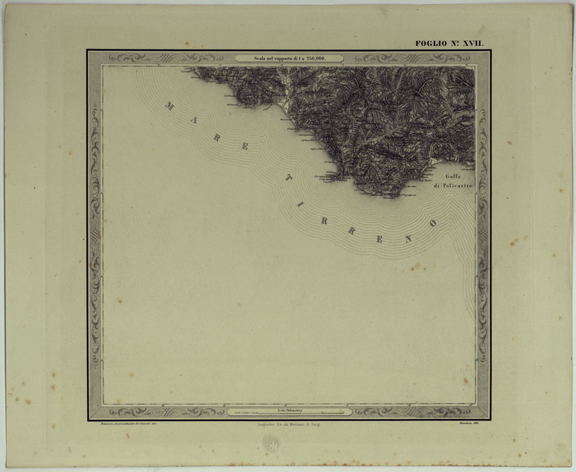 "Bella, pregevolissima carta. E' in 25 fogli oltre il foglio titolo. Su di questo sono dati i seguenti " Cenni sulla costruzione della Carta " : "Questa carta corografica è tratta da una topografica disegnata a mano alla scala di 1: 103.680, che si trovava negli Archivi dell ' ex- Ufficio Topografico di Napoli e che era dovuta allo Stato Maggiore Austriaco. Essa fu eseguita durante l'occupazione di quel Regno dal 1821 al 1824, e ne fu fondamento la nota carta del Rizzi-Zannoni, di cui la Carta Austriaca è per così dire una trasformazione. Difatti la planimetria fu poco o punto modificata ma si dette un maggior rilievo all'orografia, sostituendo, previe ricognizioni sul terreno, il metodo del tratteggio a luce zenitale, a quello della prospettiva cavaliera col quale sono rappresentate le alture nelle Carte del Zannoni. Non è certamente, né può essere un lavoro di grande esattezza geometrica, come quello che non dipende da rilievi regolari e molto meno da coordinazione di questi ad una rete di punti geodetici. Nonostante il Comitato dello Stato Maggiore credè di rendere un servizio alle varie Amministrazioni dello Stato ed al pubblico, deliberando, sin dall ' anno 1868, di utilizzarla (in via transitoria e intanto che si compivano i rilievi regolari nelle provincie meridionali) con lo scopo di somministrare una guida sufficiente al militare, al geografo ed al viaggiatore. La carta fu riconosciuta sul terreno negli anni 1868-1869 onde completarvi il sistema delle strade rotabili a fondo manufatto. Di poi si operò il disegno dei vari fogli alla scala di 1: 250.000, che fu adottata per la pubblicazione. Così ridotta essa consta di 25 fogli. La riproduzione ne fu eseguita con il sistema di fotoincisione del Maggior Generale Conte Avet ". (vedi: N. 39 d'Ordine, Cart. d'Arch. N° 71 - Docum. N° 9021, e N. 61 d' Ordine, Cart. d 'Arch. N° 72 Docum. N° 9022. Alla carta è unito un quadro d ' unione. Due copie, una delle quali incompleta e l 'altra, completa, riveduta dal 1882-1884. Una copia è questo documento d'Archivio, le altre sono d'appartenenza alla Biblioteca ai numeri d'Inv. gen. 50 e 50bis. In questo documento sono mancanti i fogli 9-13-15-16-17-20-25."