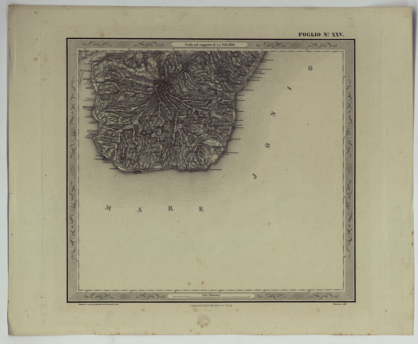 "Bella, pregevolissima carta. E' in 25 fogli oltre il foglio titolo. Su di questo sono dati i seguenti " Cenni sulla costruzione della Carta " : "Questa carta corografica è tratta da una topografica disegnata a mano alla scala di 1: 103.680, che si trovava negli Archivi dell ' ex- Ufficio Topografico di Napoli e che era dovuta allo Stato Maggiore Austriaco. Essa fu eseguita durante l'occupazione di quel Regno dal 1821 al 1824, e ne fu fondamento la nota carta del Rizzi-Zannoni, di cui la Carta Austriaca è per così dire una trasformazione. Difatti la planimetria fu poco o punto modificata ma si dette un maggior rilievo all'orografia, sostituendo, previe ricognizioni sul terreno, il metodo del tratteggio a luce zenitale, a quello della prospettiva cavaliera col quale sono rappresentate le alture nelle Carte del Zannoni. Non è certamente, né può essere un lavoro di grande esattezza geometrica, come quello che non dipende da rilievi regolari e molto meno da coordinazione di questi ad una rete di punti geodetici. Nonostante il Comitato dello Stato Maggiore credè di rendere un servizio alle varie Amministrazioni dello Stato ed al pubblico, deliberando, sin dall ' anno 1868, di utilizzarla (in via transitoria e intanto che si compivano i rilievi regolari nelle provincie meridionali) con lo scopo di somministrare una guida sufficiente al militare, al geografo ed al viaggiatore. La carta fu riconosciuta sul terreno negli anni 1868-1869 onde completarvi il sistema delle strade rotabili a fondo manufatto. Di poi si operò il disegno dei vari fogli alla scala di 1: 250.000, che fu adottata per la pubblicazione. Così ridotta essa consta di 25 fogli. La riproduzione ne fu eseguita con il sistema di fotoincisione del Maggior Generale Conte Avet ". (vedi: N. 39 d'Ordine, Cart. d'Arch. N° 71 - Docum. N° 9021, e N. 61 d' Ordine, Cart. d 'Arch. N° 72 Docum. N° 9022. Alla carta è unito un quadro d ' unione. Due copie, una delle quali incompleta e l 'altra, completa, riveduta dal 1882-1884. Una copia è questo documento d'Archivio, le altre sono d'appartenenza alla Biblioteca ai numeri d'Inv. gen. 50 e 50bis. In questo documento sono mancanti i fogli 9-13-15-16-17-20-25."