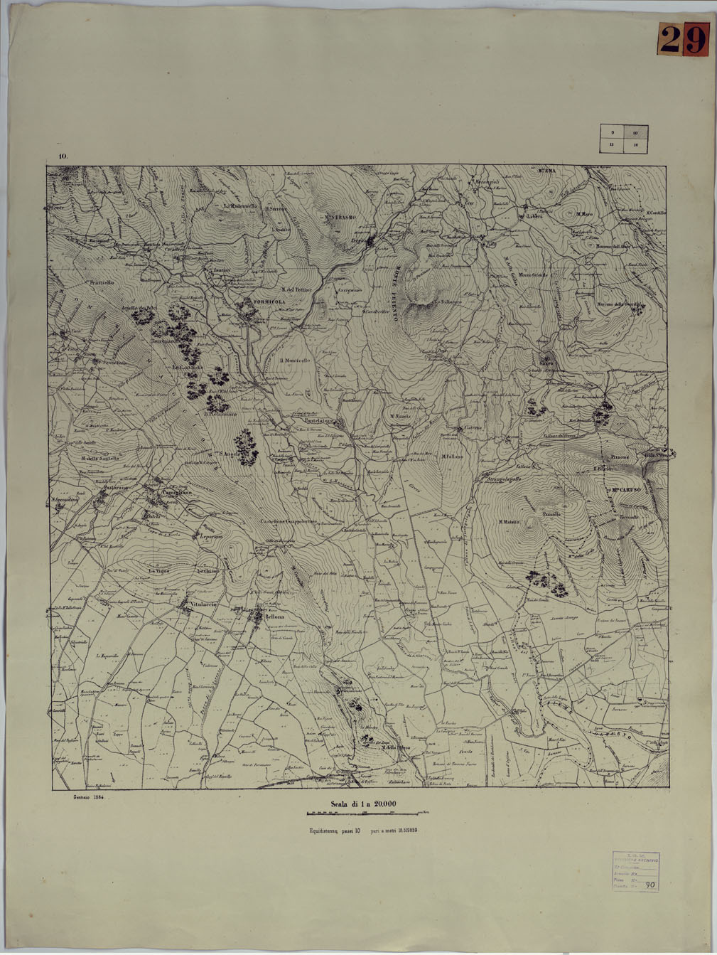"Carta in quattro fogli stampati in nero, con orografia a curve di livello tracciate all'equidistanza di 10 in 10 passi geodetici (m. 18,519859). Annesso un quadro d'unione. Due copie. Interessante per la ricostruzione archeologica della città."