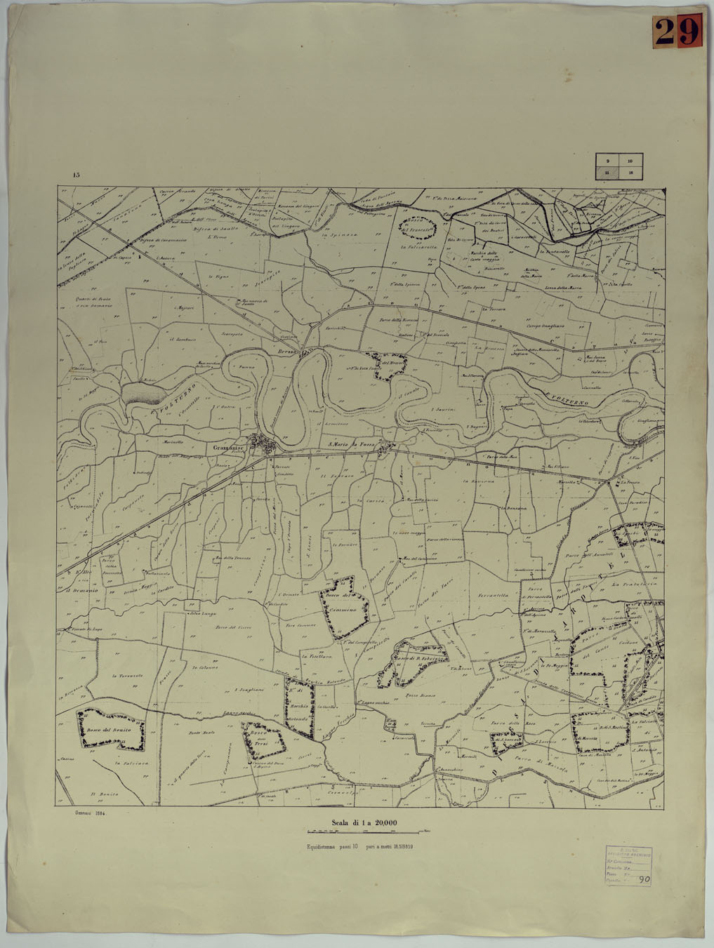 "Carta in quattro fogli stampati in nero, con orografia a curve di livello tracciate all'equidistanza di 10 in 10 passi geodetici (m. 18,519859). Annesso un quadro d'unione. Due copie. Interessante per la ricostruzione archeologica della città."