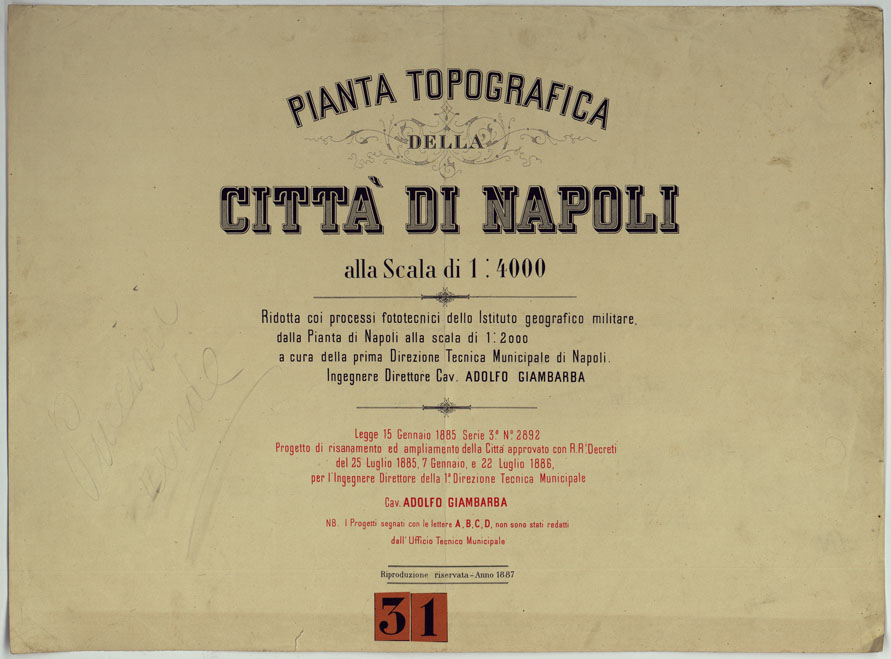 "Ridotta coi processi fototecnici dello Istituto Geografimo Militare dalla pianta di Napoli alla scala di 1:2.000 a cura della prima direzione tecnica municipale di Napoli. Ingegnere Direttore Cav. Adolfo Giambarba. Documento formato da 23 fogli , più varie copie. "