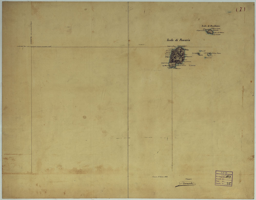 "Docum. n. 22. Disegno analogo al Docum. n. 21 - Categ. 8818 - "Isole di Alicudi e Filicudi" alla stessa scala, stessa data, stesso autore. Un foglio montato su tela. Cfr. anche altre carte delle Isole Eolie dello stesso periodo: Isola Salina - Isola di Lipari - Isole di Alicudi e Filicudi - Isola di Stromboli - Isola Vulcano e Isola d'Ustica. "