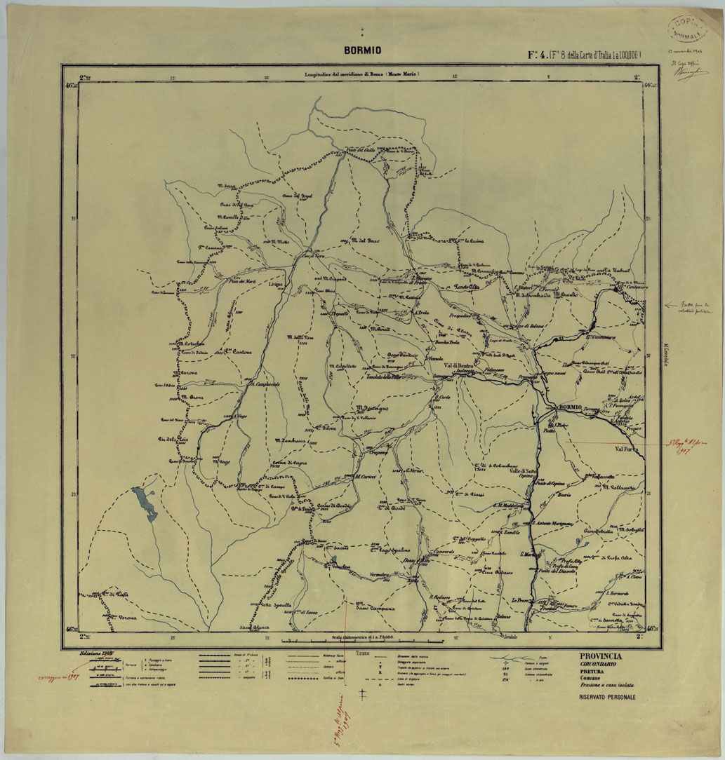 CARTA ITINERARIA D'ITALIA PER GLI ALPINI NORMALI D'ARCHIVIO CON AGGIORNAMENTO FINO AL 1910 EDIZIONE COMPLETA ANNO 1907 - FOGLIO 4 BORMIO.