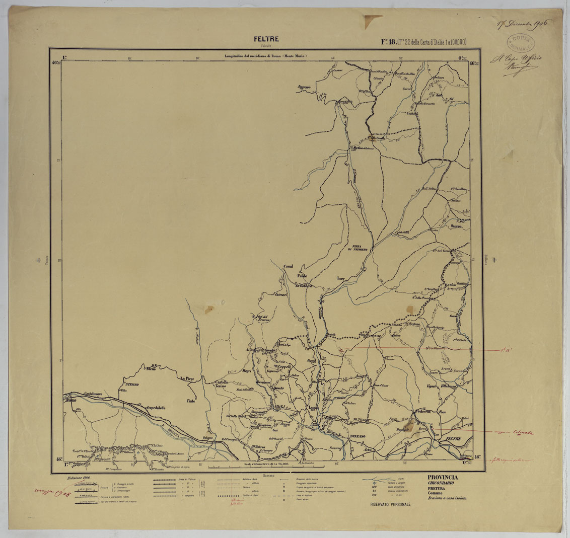 CARTA ITINERARIA D'ITALIA PER GLI ALPINI NORMALI D'ARCHIVIO CON AGGIORNAMENTO FINO AL 1910 EDIZIONE COMPLETA ANNO 1908 - FOGLIO 18 FELTRE.