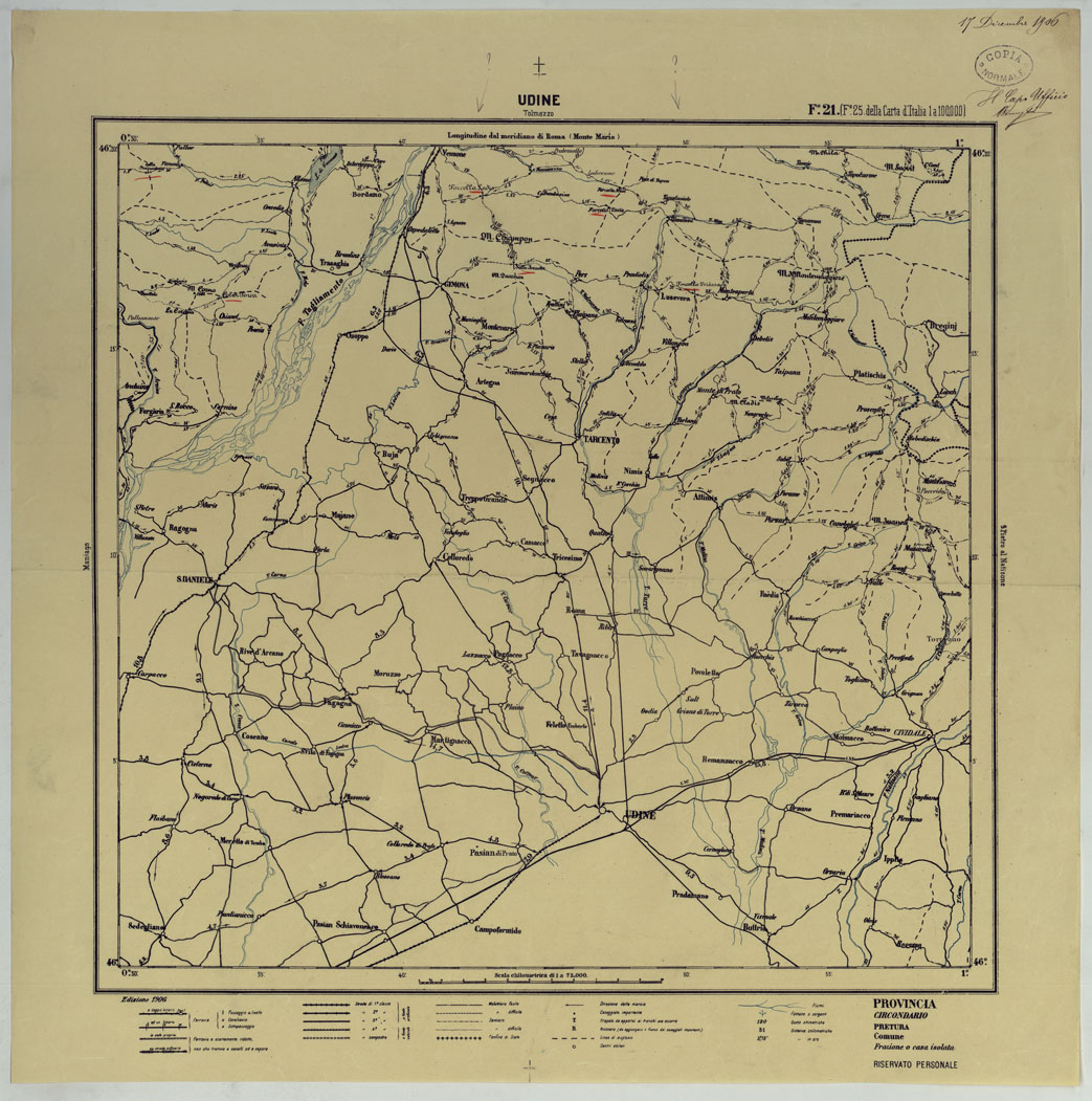 CARTA ITINERARIA D'ITALIA PER GLI ALPINI NORMALI D'ARCHIVIOCON AGGIORNAMENTO FINO AL 1910 EDIZIONE COMPLETA ANNO 1906 - FOGLIO 21 UDINE.