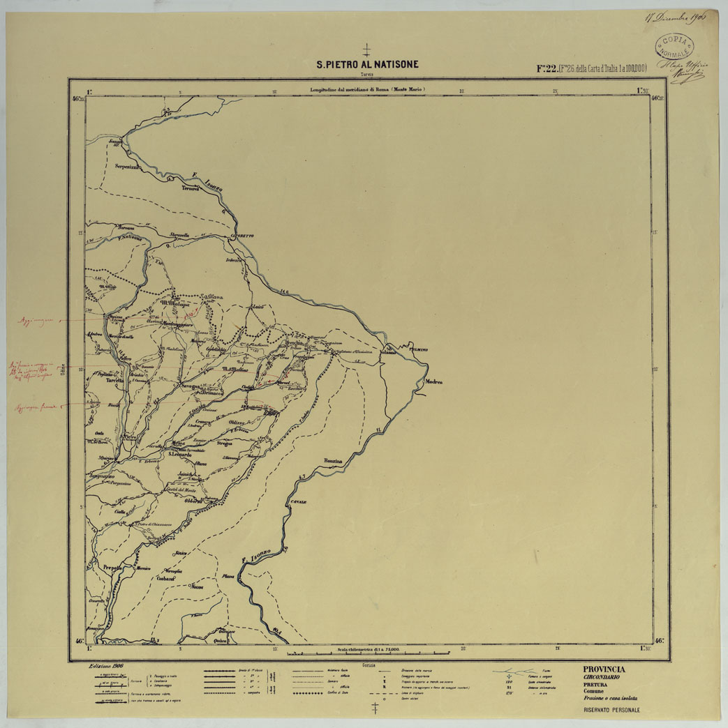 CARTA ITINERARIA D'ITALIA PER GLI ALPINI NORMALI D'ARCHIVIO CON AGGIORNAMENTO FINO AL 1910 EDIZIONE COMPLETA ANNO 1906 - FOGLIO 22 S. PIETRO AL NATISONE.