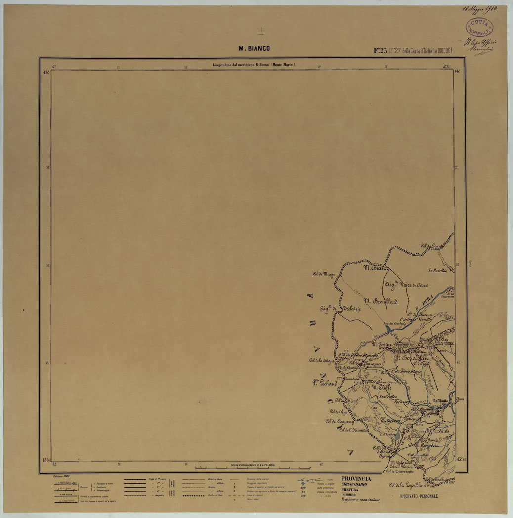 CARTA ITINERARIA D'ITALIA PER GLI ALPINI NORMALI D'ARCHIVIO CON AGGIORNAMENTO FINO AL 1910 EDIZIONE COMPLETA ANNO 1906 - FOGLIO 23 M. BIANCO.
