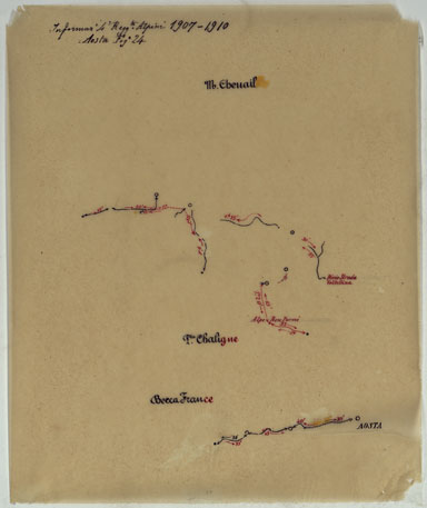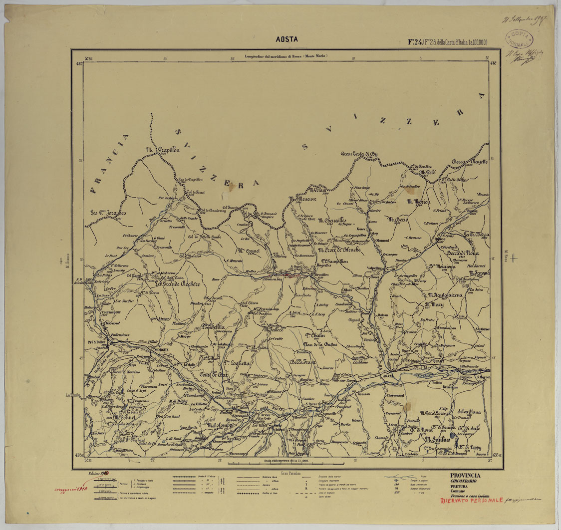 CARTA ITINERARIA D'ITALIA PER GLI ALPINI NORMALI D'ARCHIVIO CON AGGIORNAMENTO FINO AL 1910 EDIZIONE COMPLETA ANNO 1910 - FOGLIO 24 AOSTA.