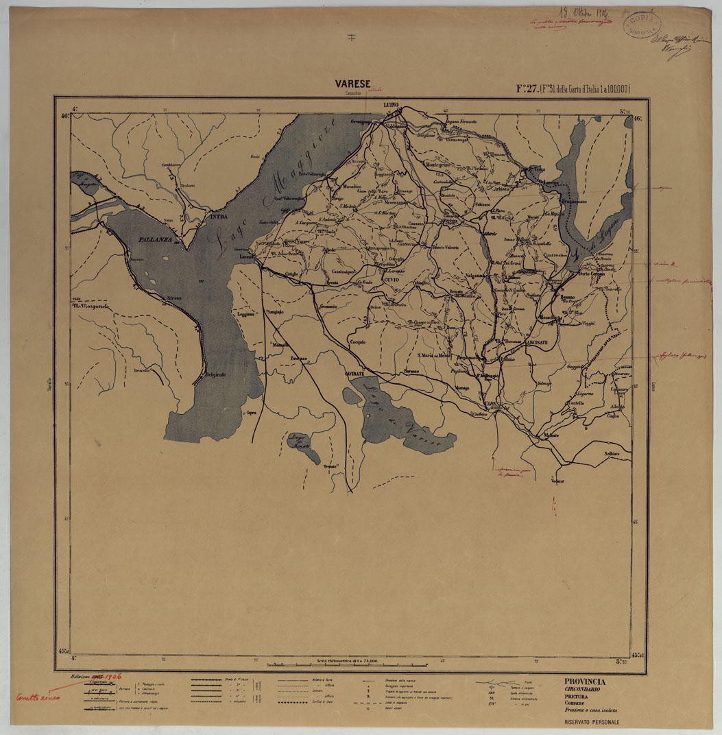 CARTA ITINERARIA D'ITALIA PER GLI ALPINI NORMALI D'ARCHIVIO CON AGGIORNAMENTO FINO AL 1910 EDIZIONE COMPLETA ANNO 1906 - FOGLIO 27 VARESE.