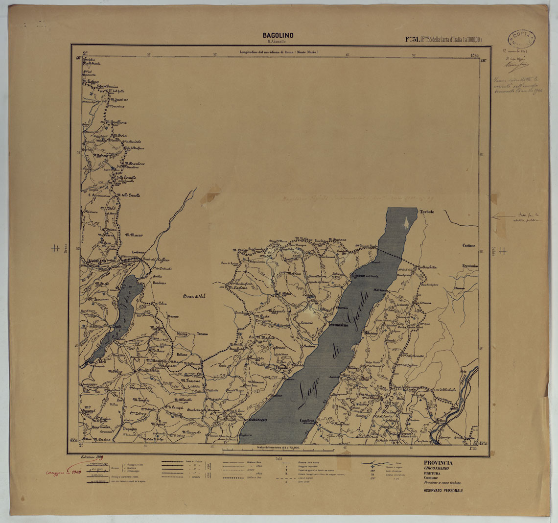 CARTA ITINERARIA D'ITALIA PER GLI ALPINI NORMALI D'ARCHIVIO CON AGGIORNAMENTO FINO AL 1910 EDIZIONE COMPLETA ANNO 1909 - FOGLIO 31 BAGOLINO.