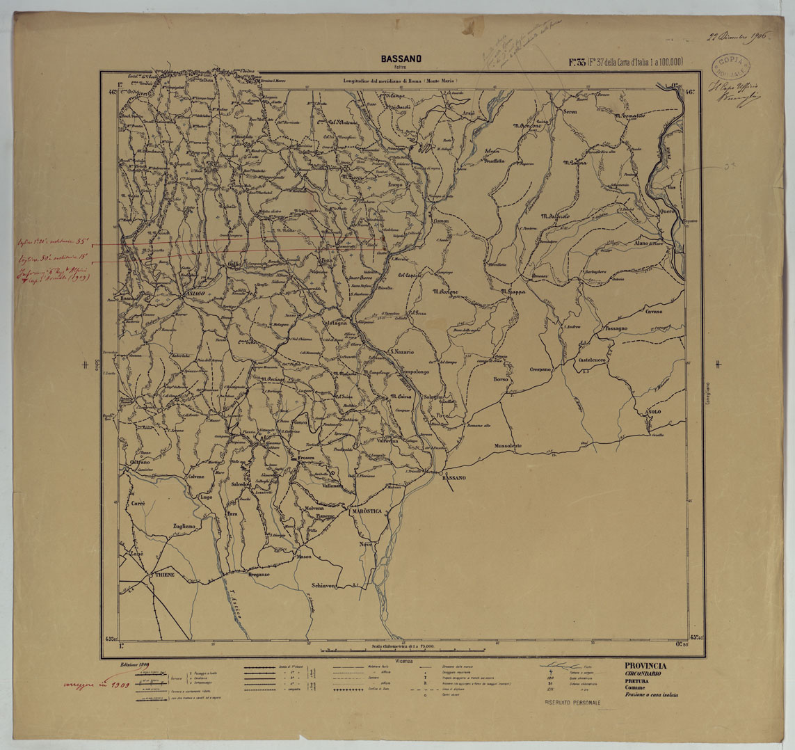 CARTA ITINERARIA D'ITALIA PER GLI APLINI NORMALI D'ARCHIVIO CON AGGIORNAMENTO FINO AL 1910 EDIZIONE COMPLETA ANNO 1909 - FOGLIO 33 BASSANO.