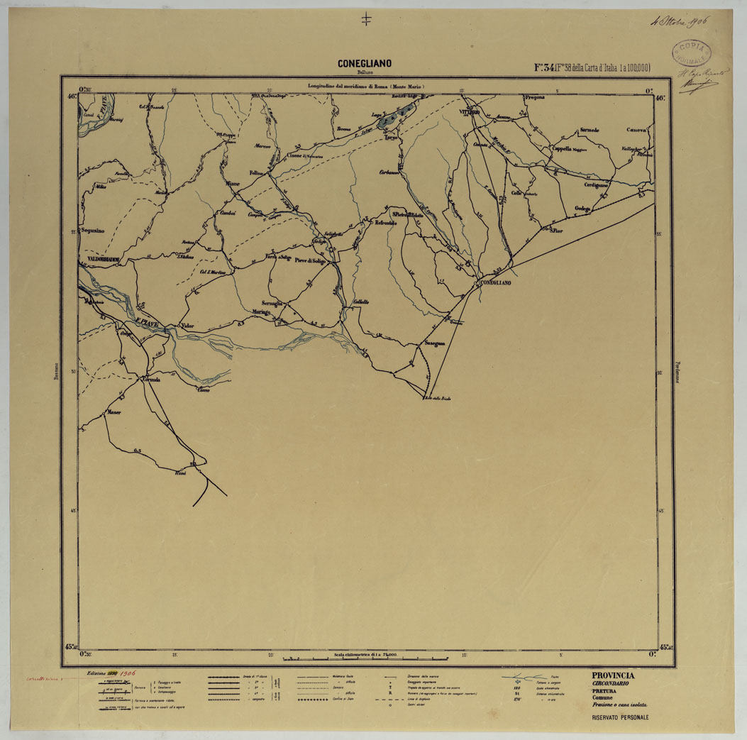 CARTA ITINERARIA D'ITALIA PER GLI ALPINI NORMALI D'ARCHIVIO CON AGGIORNAMENTO FINO AL 1910 EDIZIONE COMPLETA ANNO 1906 - FOGLIO 34 CONEGLIANO.