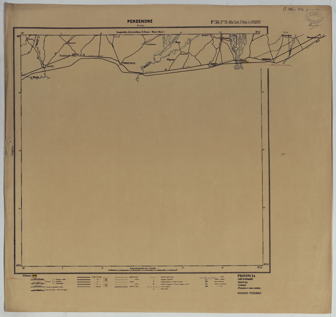 CARTA ITINERARIA D'ITALIA PER GLI ALPINI NORMALI D'ARCHIVIO CON AGGIORNAMENTO FINO AL 1910 EDIZIONE COMPLETA ANNO 1906 - FOGLIO 35 PORDENONE.