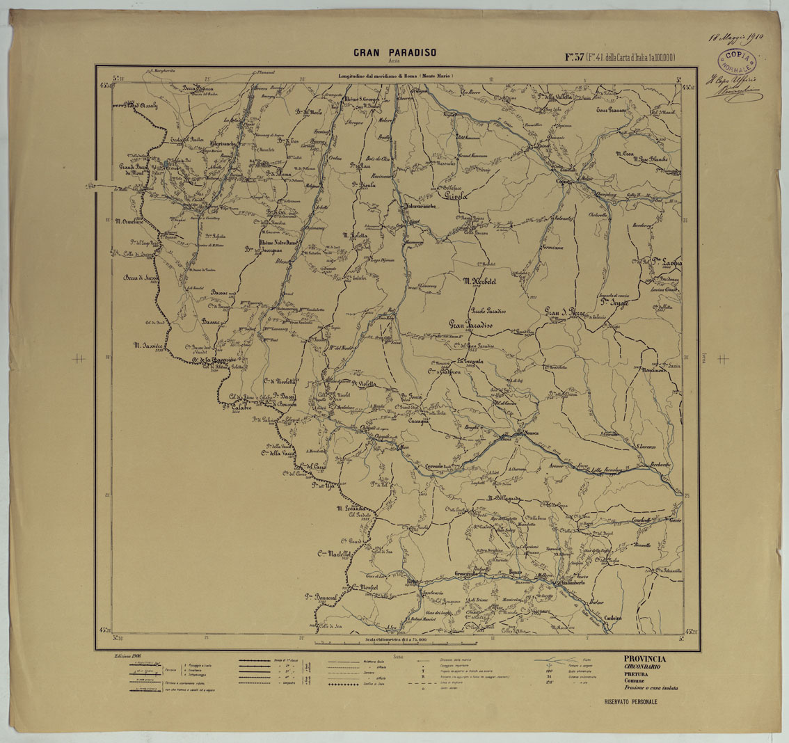 CARTA ITINERARIA D'ITALIA PER GLI ALPINI NORMALI D'ARCHIVIO CON AGGIORNAMENTO FINO AL 1910 EDIZIONE COMPLETA ANNO 1906 - FOGLIO 37 GRAN PARADISO.