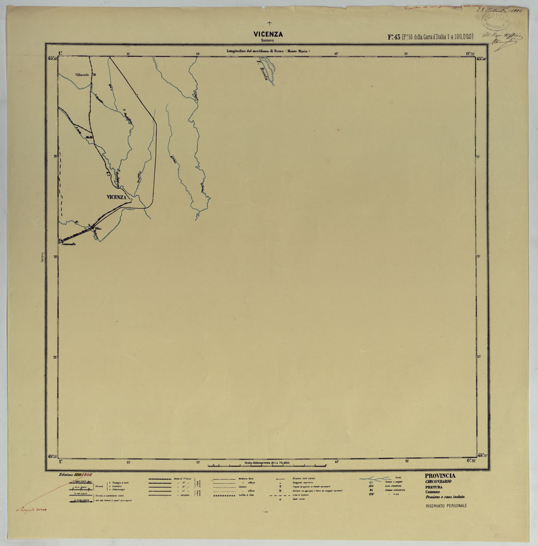 CARTA ITINERARIA D'ITALIA PER GLI ALPINI NORMALI D'ARCHIVIO CON AGGIORNAMENTO FINO AL 1910 EDIZIONE COMPLETA ANNO 1906 - FOGLIO 43 VICENZA.