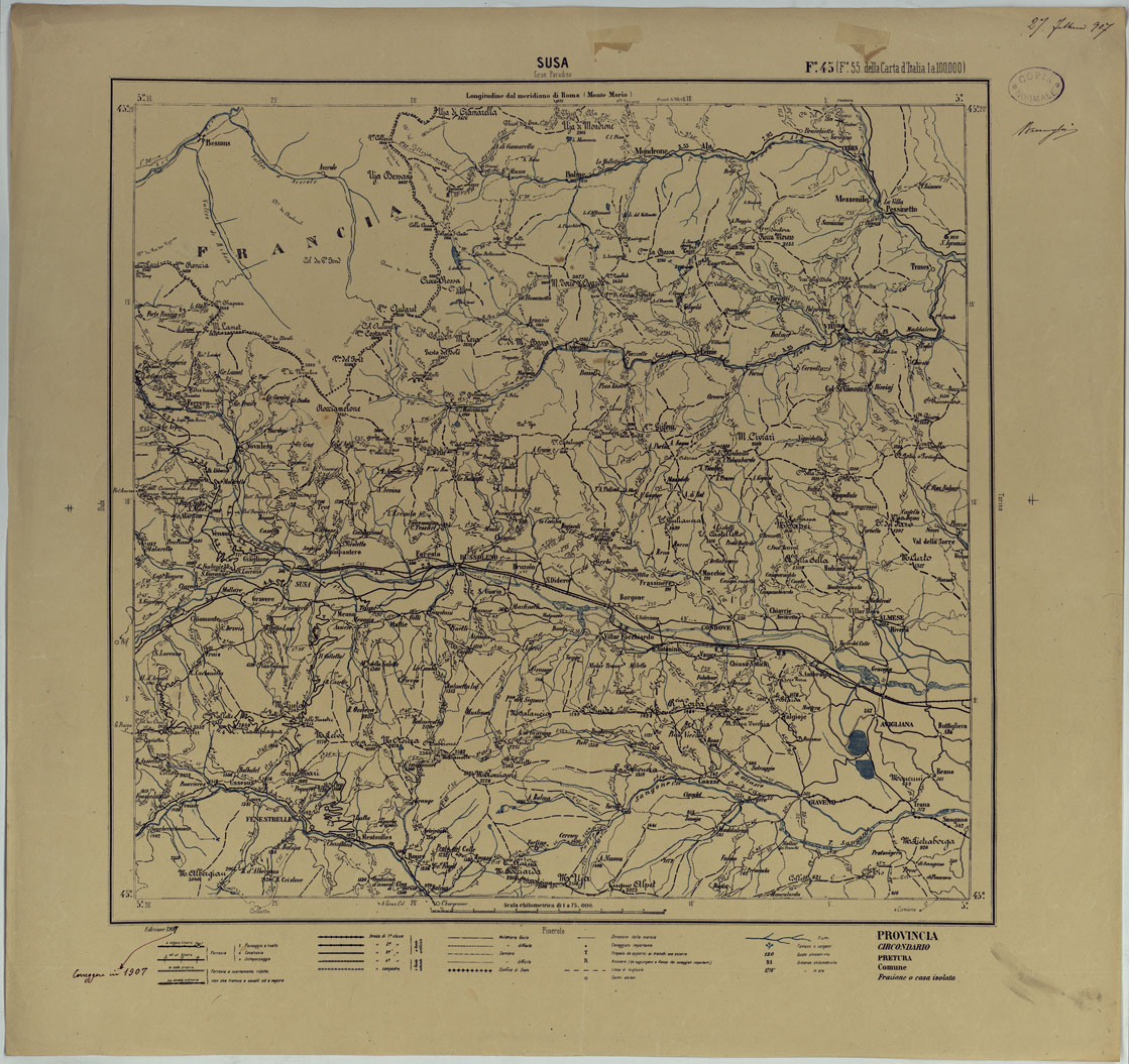 CARTA ITINERARIA D'ITALIA PER GLI ALPINI NORMALI D'ARCHIVIO CON AGGIORNAMENTO FINO AL 1910 EDIZIONE COMPLETA ANNO 1907 - FOGLIO 45 SUSA.