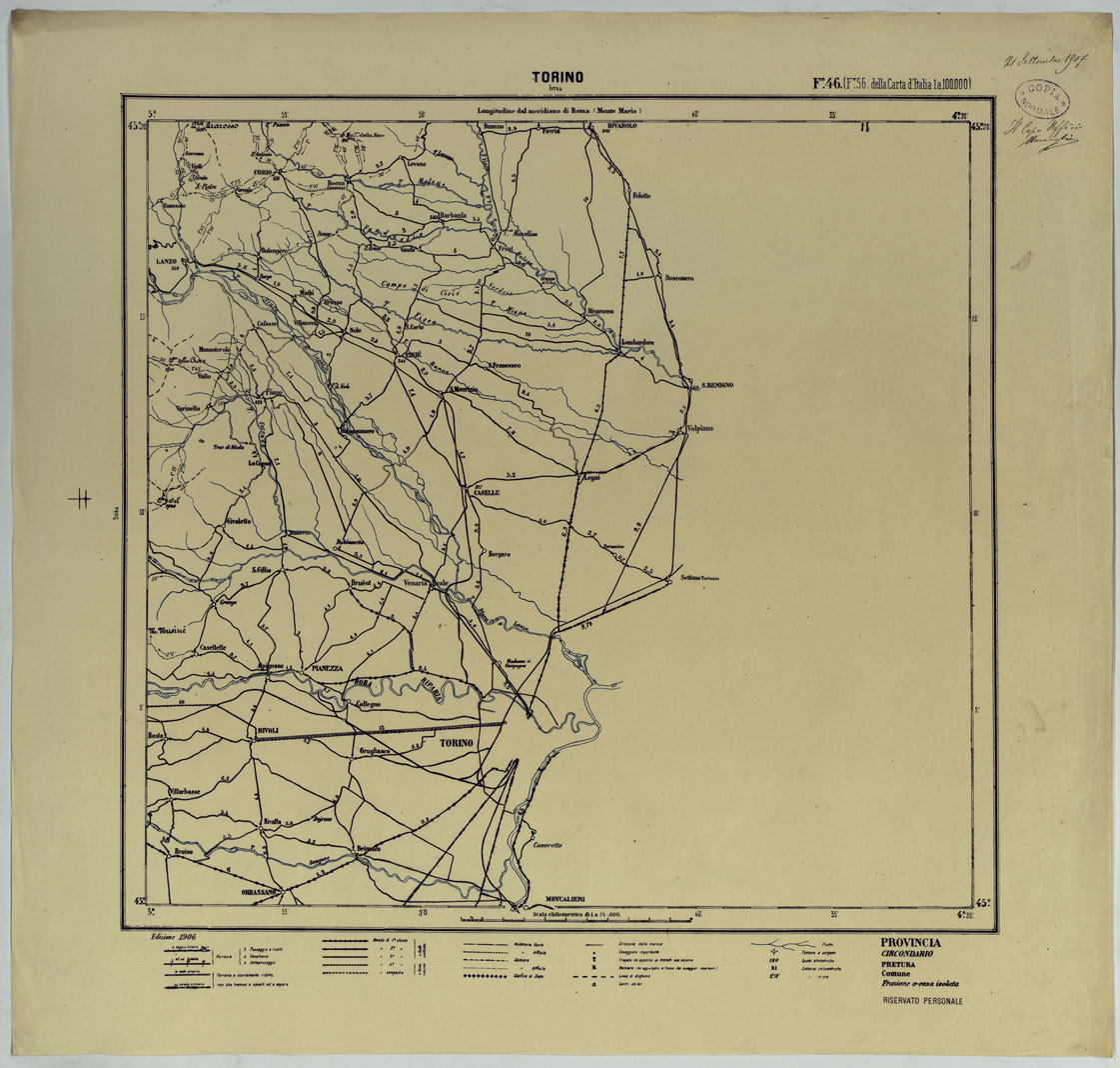 CARTA ITINERARIA D'ITALIA PER GLI ALPINI NORMALI D'ARCHIVIO CON AGGIORNAMENTO FINO AL 1910 EDIZIONE COMPLETA ANNO 1907 - FOGLIO 46 TORINO.