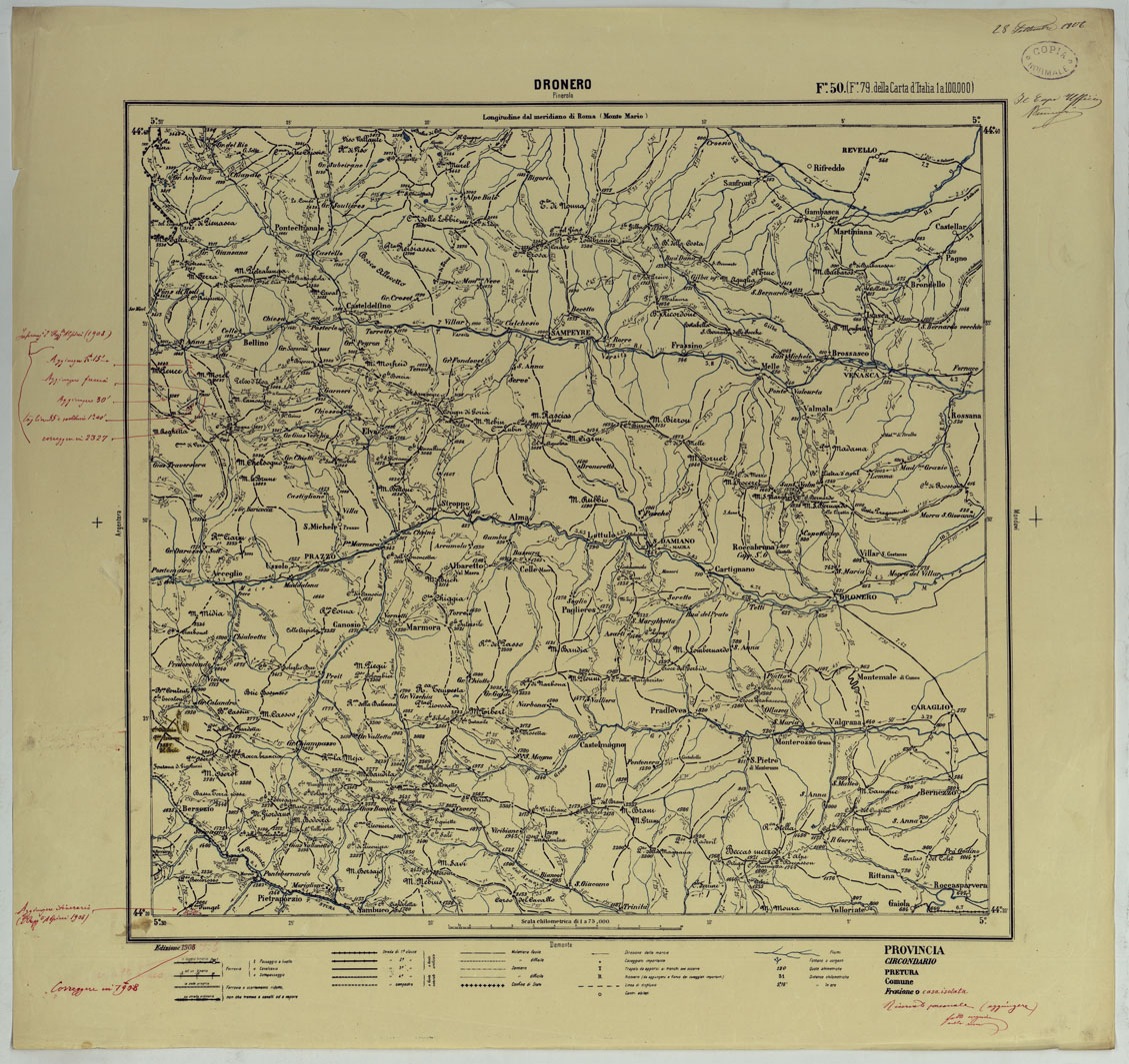CARTA ITINERARAIA D'ITALIA PER GLI ALPINI NORMALI D'ARCHIVIO CON AGGIORNAMENTO FINO AL 1910 EDIZIONE COMPLETA ANNO 1908 - FOGLIO 50 DRONERO.