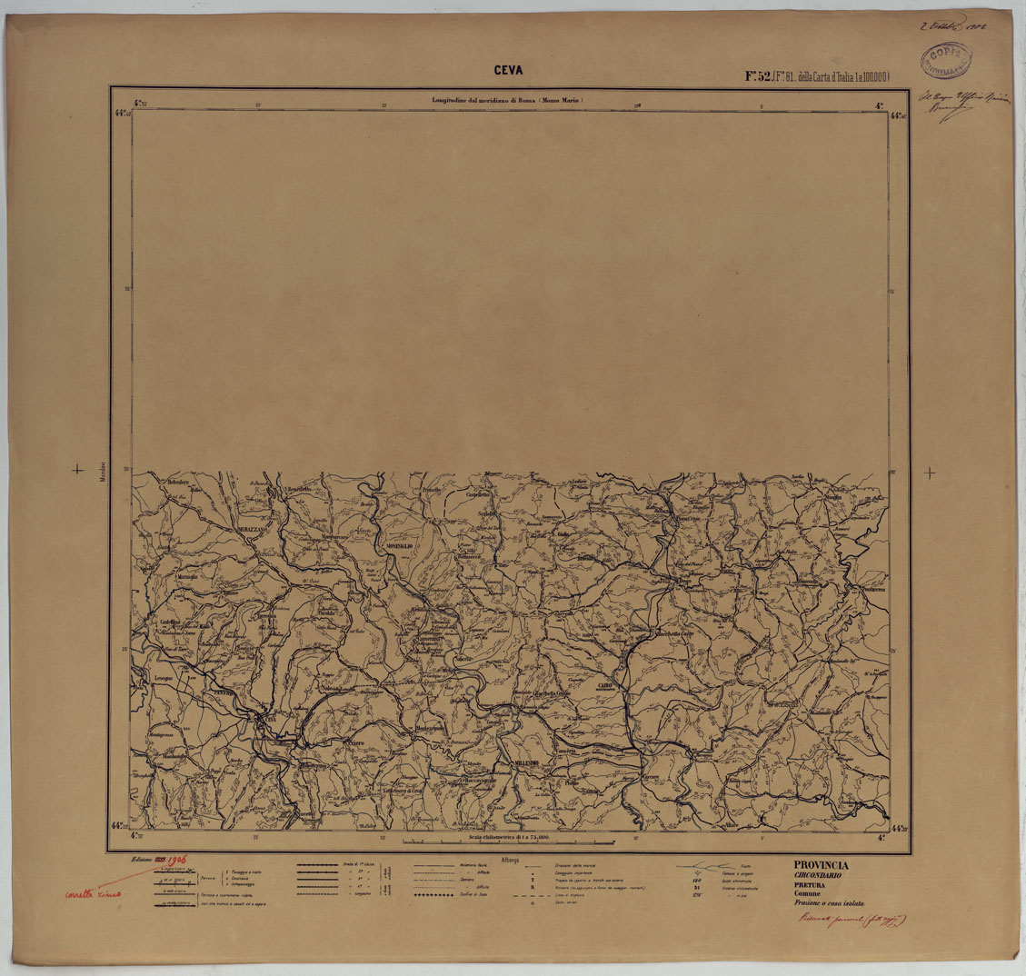 CARTA ITINERARIA D'ITALIA PER GLI ALPINI NORMALI D'ARCHIVIO CON AGGIORNAMENTO FINO AL 1910 EDIZIONE COMPLETA ANNO 1906 - FOGLIO 52 CEVA.