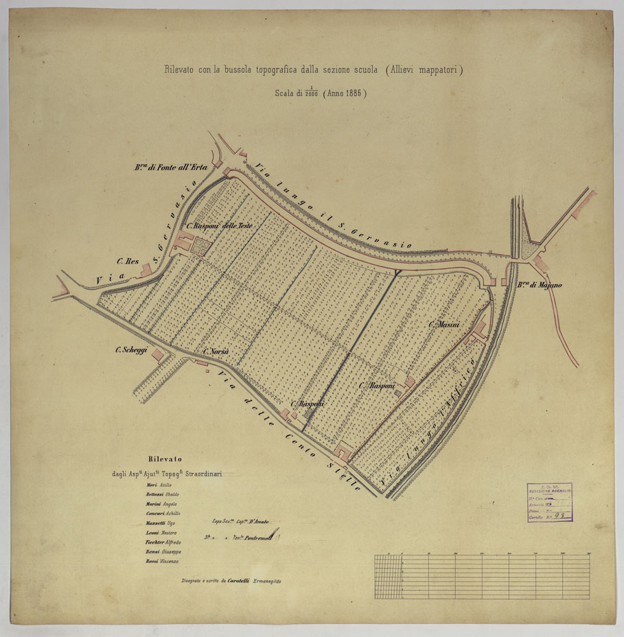 "Rilevato con la bussola topografica dalla sezione scuola (allievi mappatori) anno 1886."