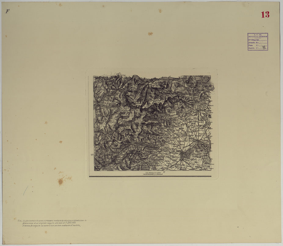 "La planimetria e le curve si ottennero mediante la riproduzione in fotoincisione di un originale eseguito alla scala di 1:250.000. Il terreno fu eseguito su rame a luce zenitale mediante la "roulette"."
