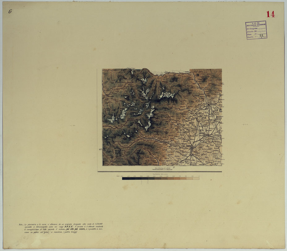 "La planimetria e le curve si ottennero da un originale disegnato alla scala di 1:250.000 riprodotto in fotozincografia come nei saggi D,D,E.E,. Il terreno si è ottenuto mediante la sovrapposizione di tinte secondo il sistema più alto più sicuro e riprodotte in incisione su pietra col "grisè" a macchina. "